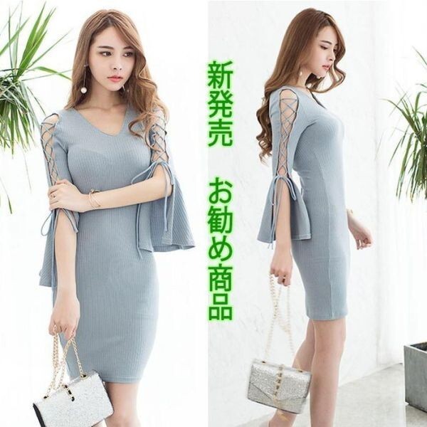 > ニットドレス ショート丈 フレア袖 伸縮 ラウンドネック ラップ コットン スリット 腕紐付き レディース 空色 M