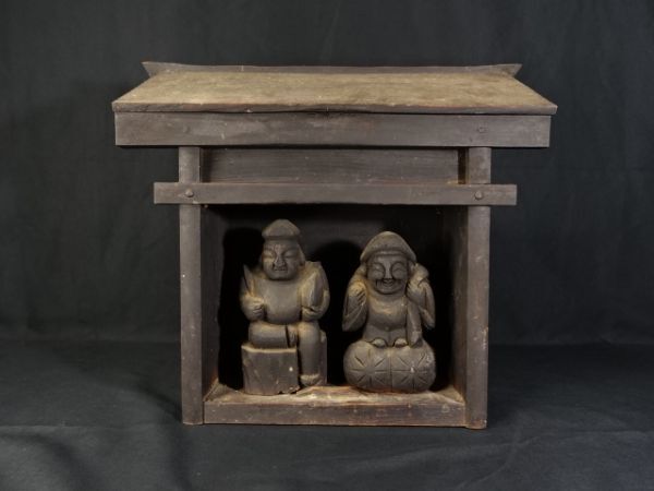 - 233 時代木彫り 厨子入恵比寿大黒 江戸期 厨子約31x36.5x12.5㎝