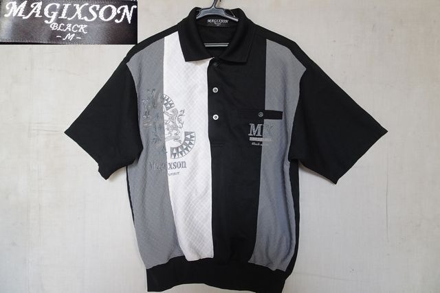 > MAGIXSON BLACK/襟付半袖シャツ/プルオーバー/右胸ししゅう入/裾リブ/モノトーン/黒/ブラック/グレー/白/ホワイト/Mサイズ(9/30R7)