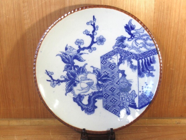 - ◆イゲ皿:紅ぶち◆『屏風絵:七宝繋ぎ:唐獅子:牡丹梅之図』◆尺皿◆明治印判◆完品◆