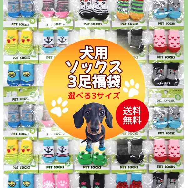 - 送料無料 犬用 ソックス 3足セット 福袋 (Lサイズのみ,柄は選べません.お楽しみに!) 滑り止め 靴下 肉球 保護 介護 怪我 防寒 小型 犬 猫