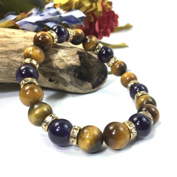 > タイガーアイ×アメジスト パワーストーン ブレスレット 天然石ブレス (ゴールド) 10mm メンズ・レディース 金運 仕事運 願望成就