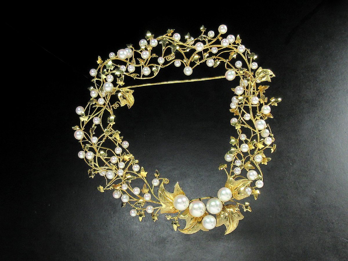 > IVY K18YG 3.1mm~7.9mm 79粒 アコヤ真珠 リーフモチーフ イエローゴールド デザイン ビッグ ブローチ 32.1g J439