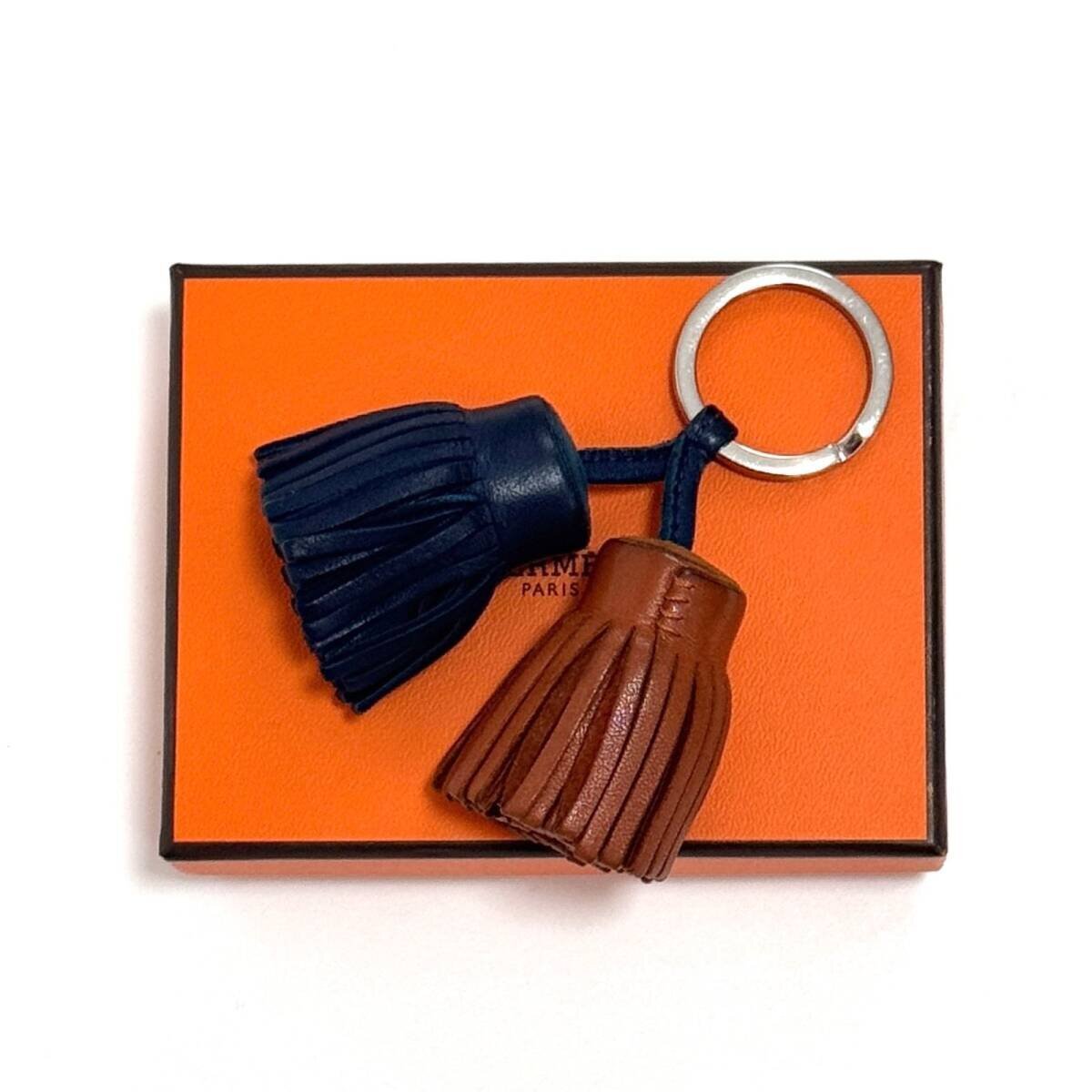 - エルメス カルメン ウノドス キーリング チャーム キーホルダー アクセサリー バッグチャーム ブラウン ネイビー シルバー レザー HERMES