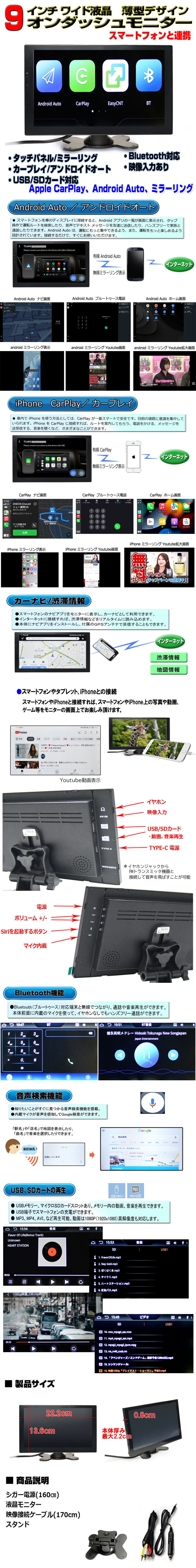 - 12v&24v 9インチオンダッシュモニター タッチパネル Apple CarPlay Android Auto ミラーリング ブルートゥース 外部入力 USB SD動画、音楽