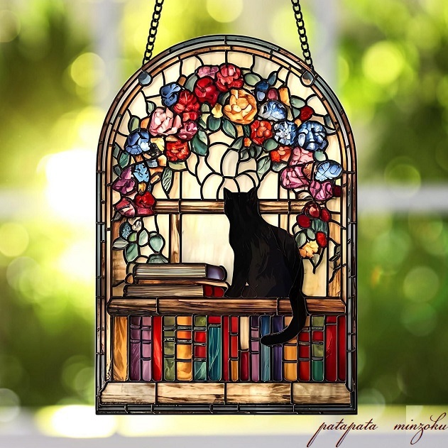 - 黒猫 アクリルプレート アクリルペンダント ディスプレイ ステンドグラス 風 看板 ウォールディスプレイ ねこ ネコ 花 バラ 本 パタミン