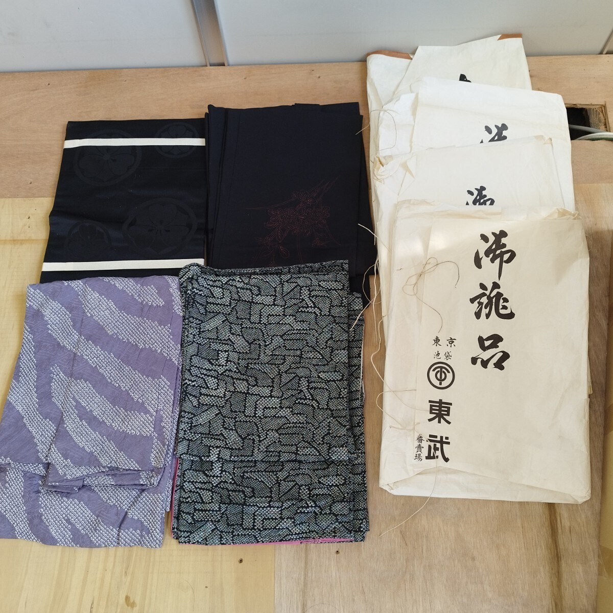 - 戸06c 高級着物 4枚 帯1点 まとめ 売り 着物 和装 和柄 和服 レトロ柄 裏地 紫色 黒色 リメイク 材料 素材 生地 東武