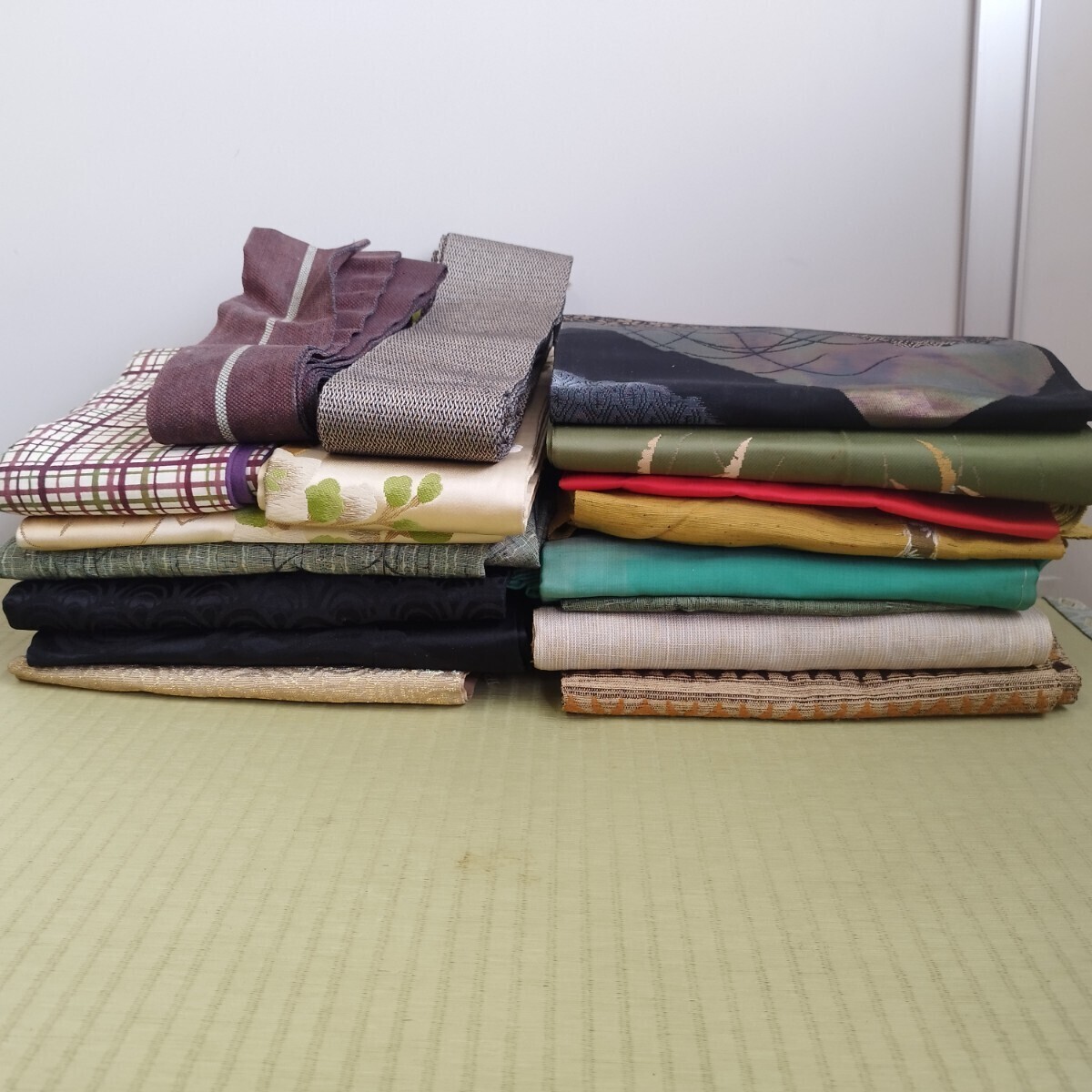 - 戸06c 高級和装 着物 帯 まとめ 10点以上 正絹 袋帯 名古屋帯 訪問着 小紋 縮緬 大島紬 刺繍 藍染 単衣 和柄 生地 リメイク 着用