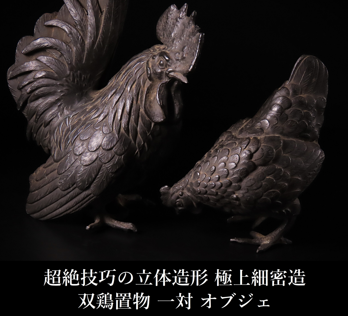- 【ONE'S】超絶技巧の立体造形 双鶏置物 一対 極上細密造 オブジェ 飾物 古美術品