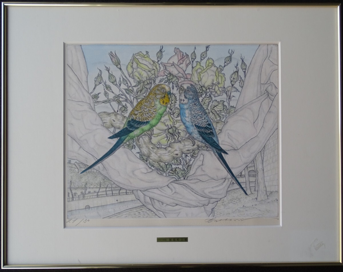 > ・作者名:服部 和三郎(新制作協会 ・画題:バラとセキセイインコ ・技法:リトグラフ 限定(21/50) (R4-5-20)