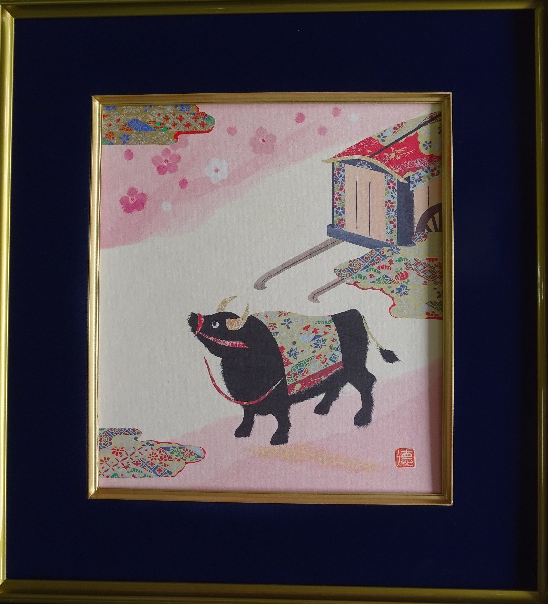 - ・作者: 並川徳子 ・画題:牛車(表)鯉(裏) ・技法: 色紙和紙ちぎり絵 ・NO-R6-5-8.9