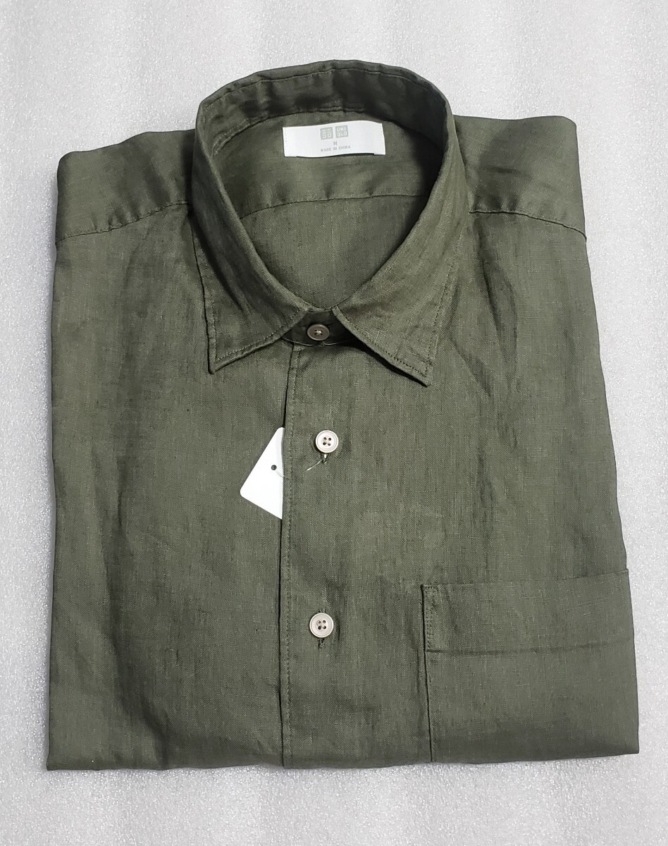 > Mサイズ 新品 ユニクロ プレミアムリネンシャツ オリーブ 長袖シャツ 胸ポケット有り ヨーロッパ栽培リネン100% 麻100% uniqlo 送料無料