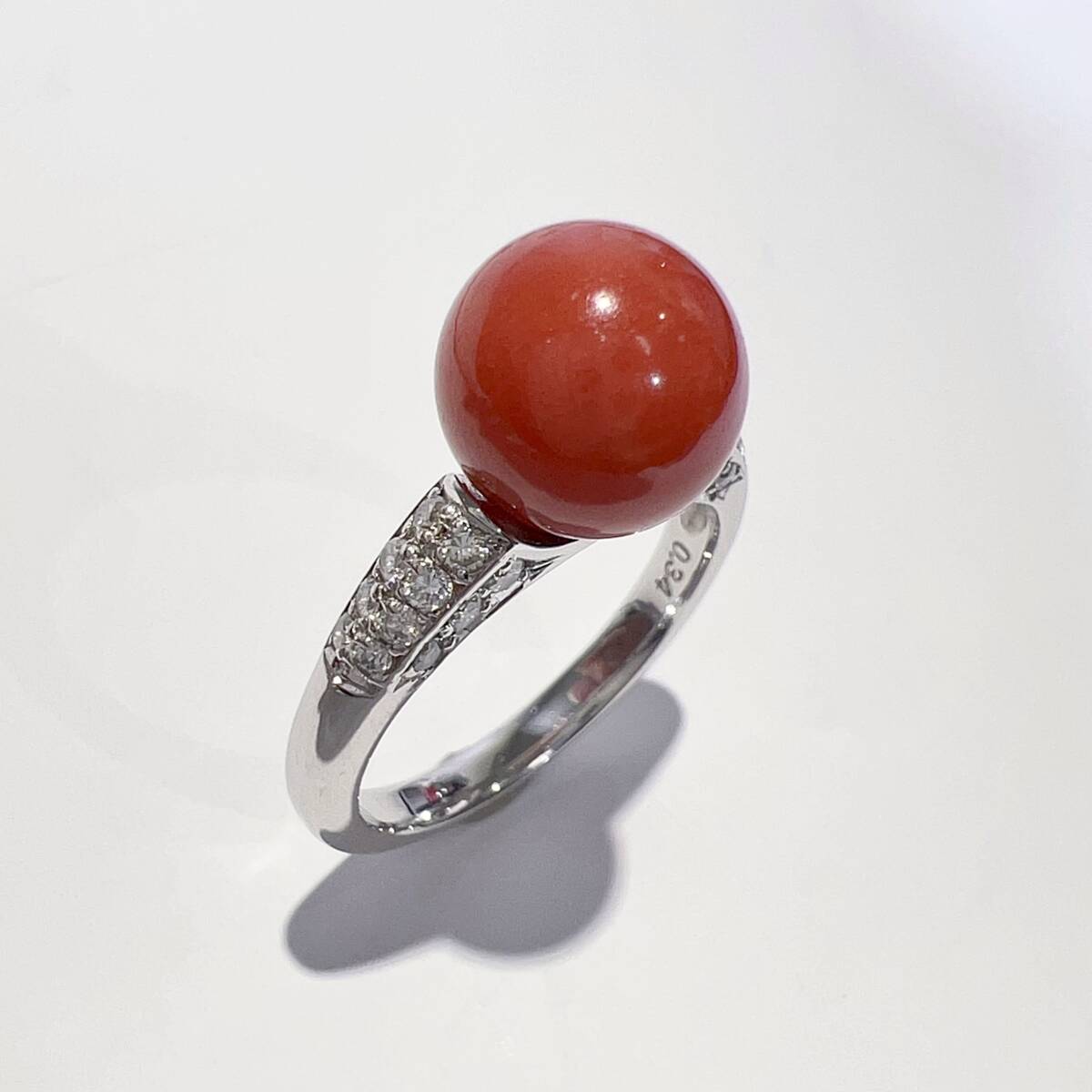 - Pt900 天然 珊瑚 サンゴ ダイヤ リング 11.5号 9.2mm D0.034ct 6.0g レディース アクセサリー 指輪 美品