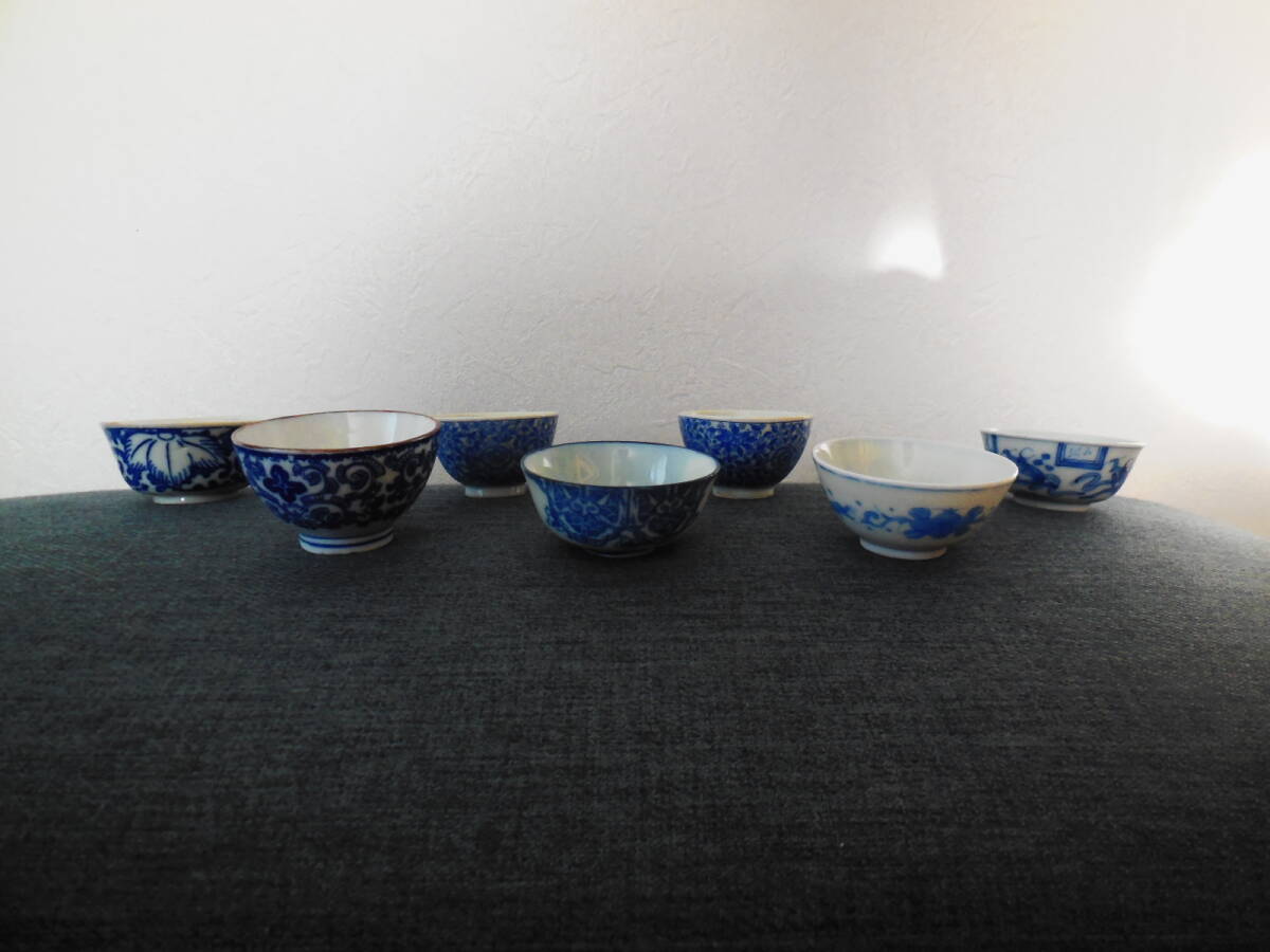 - ★煎茶道具 煎茶碗 染付煎茶碗 七客 口紅 花唐草 動植物 微塵唐草★