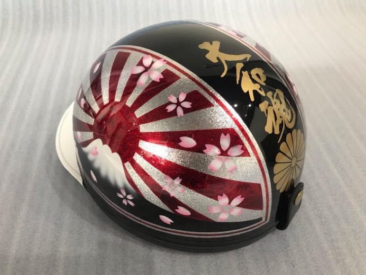 - レッドラメ ラップ塗装 富士日章 カスタム コルク半 ヘルメット 旧車會 暴走族 三段シート 風防