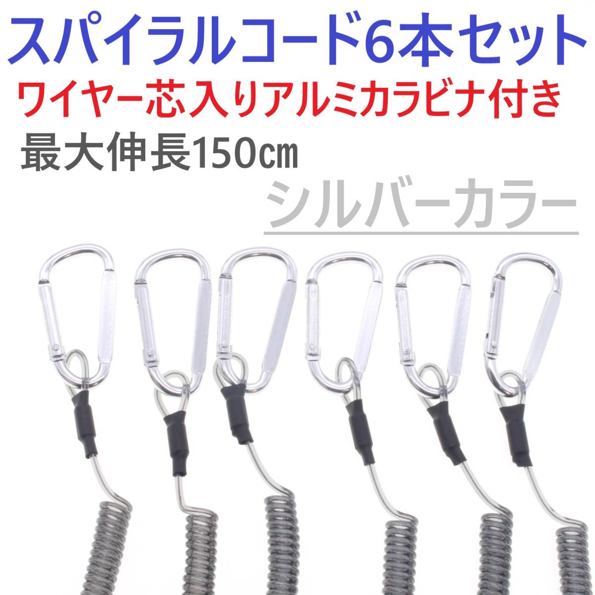 - 【送料無料】カールコード シルバー 6本セット スパイラルコード ワイヤー芯入り アルミカラビナ付き 釣り道具 工具 落下防止に 尻手ロープ