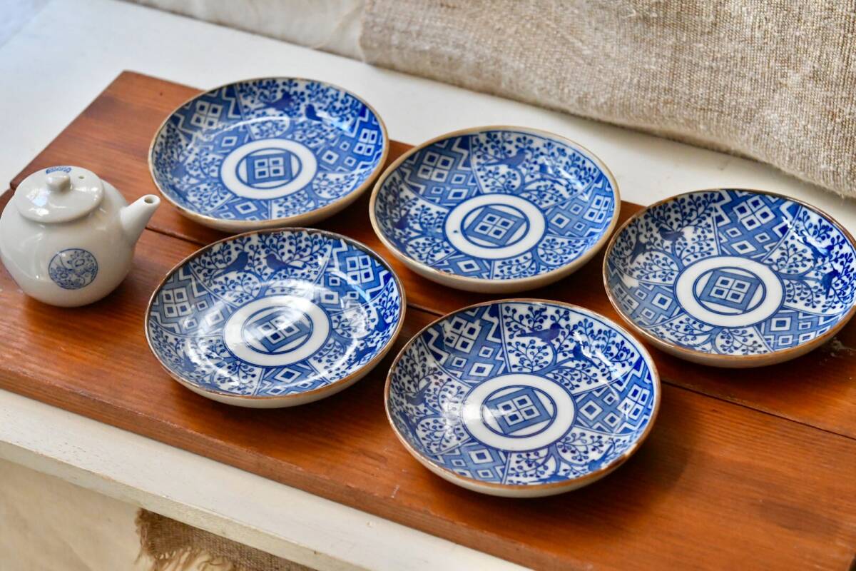 - 可愛いことりのお皿と丸っこい醤油差し 染付印判古皿5枚 木の実と小鳥 丸紋ソースポット 古民家古食器 レトロ 骨董アンティーク