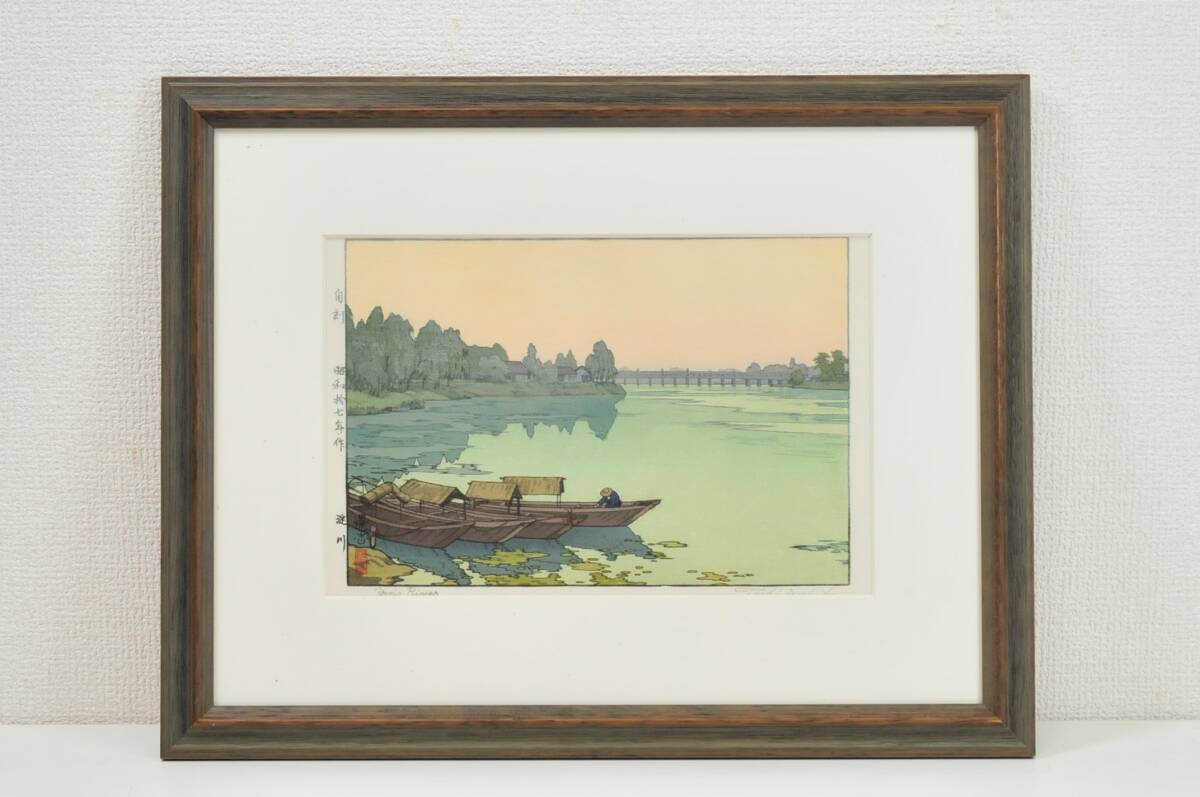 - 【真作】 吉田遠志 木版画 自刻 昭和拾七年作 『淀川』 サイン 額装:33×42cm 箱無 03207072-1