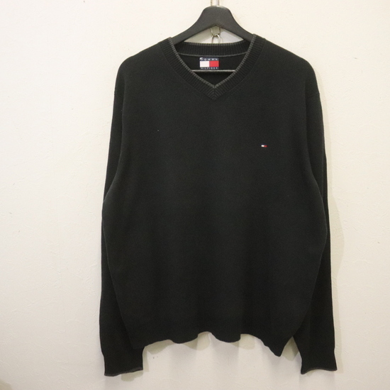 - X739 2009年製 トミーヒルフィガー コットンニットセーター■00s 表記Mサイズ 黒 ブラック Vネック ワンポイントロゴ アメカジ 古着