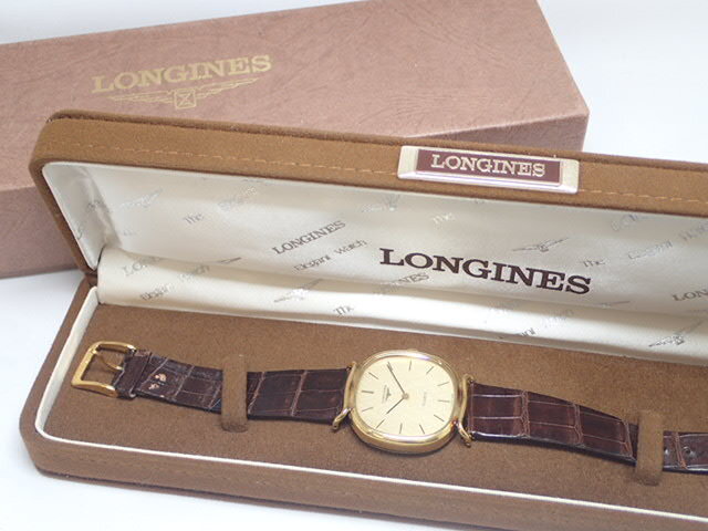 - 10022[T]LONGINES ロンジン メンズ腕時計 ゴールドカラー スクエア 純正尾錠・ベルト ケース付き