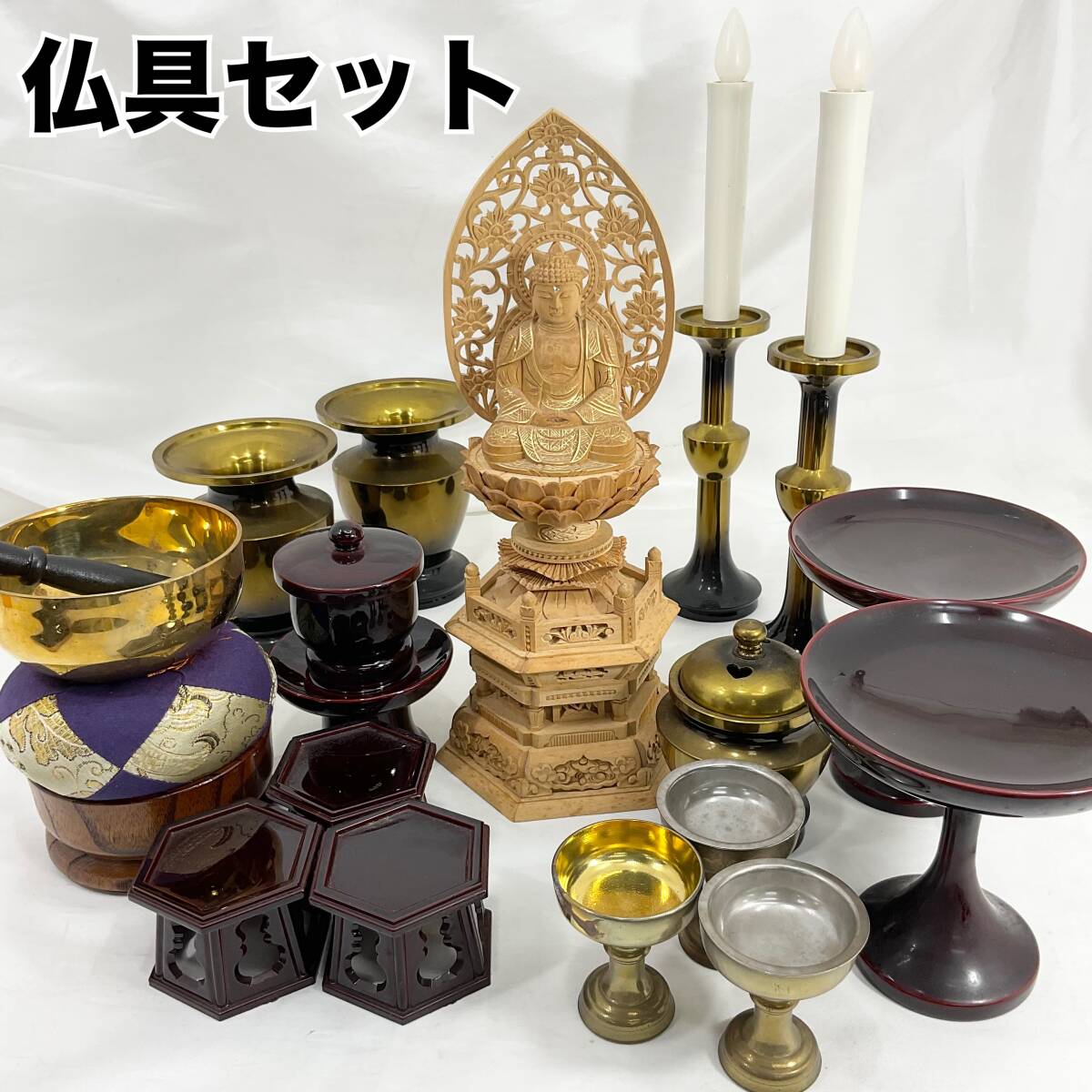 - 仏具セット 仏像 座釈迦 木像釈迦如来 木彫り 六角台座 おりん 布団 香炉 電子ローソク 高月 仏飯器 仏飯器台 花立て 香道具 真鍮(C182)