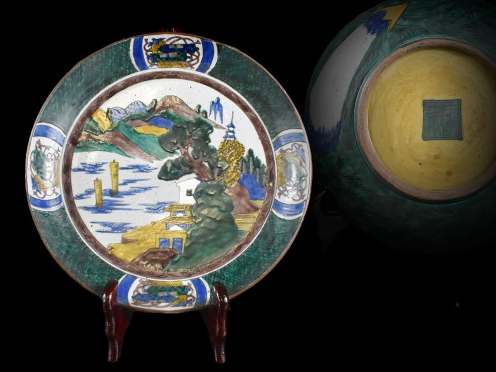 > 【雲】某名家買取品 古九谷 青手楼閣山水絵付大皿 直径37.5cm 古美術品(吉田屋再興九谷)BJ1784 UTgfds