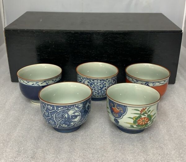 - C189-077→有田焼 仁彩 湯呑み 茶碗 色違い 5客