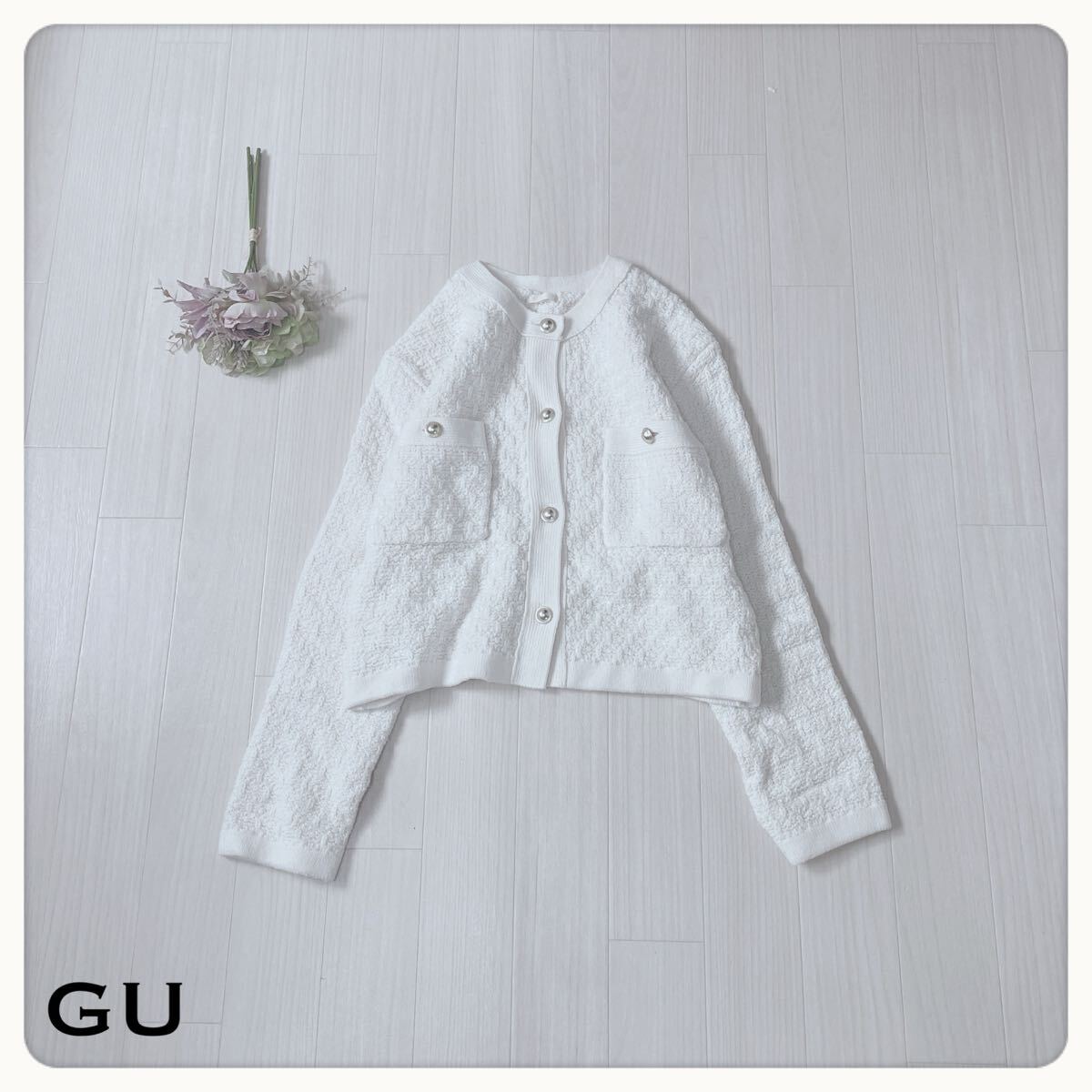 - 【美品】GU ジーユー ノーカラー ツイード ジャケット レディース ホワイト 白 オフホワイト アクリル混 ボタンデザイン 春秋 S