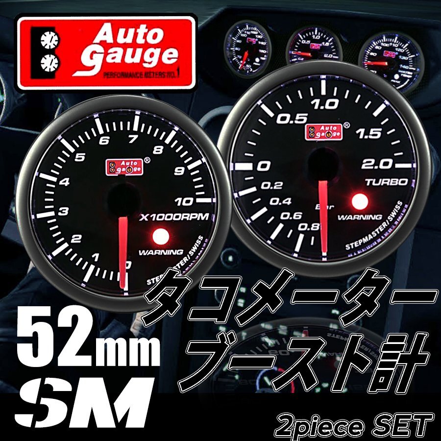 > オートゲージ タコメーター ブースト計 52Φ SM 2点セット スイス製モーター スモークレンズ ワーニング オープニングセレモニー
