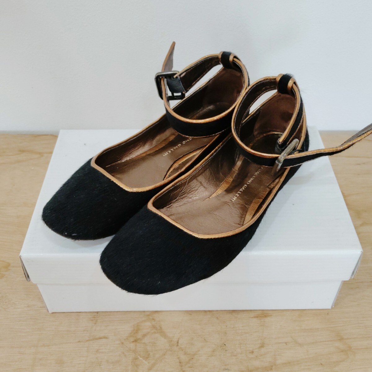 - GUILD JACOMO GALLERY パンプス 23.5cm アンクルストラップ フラット ファー 黒 レディース