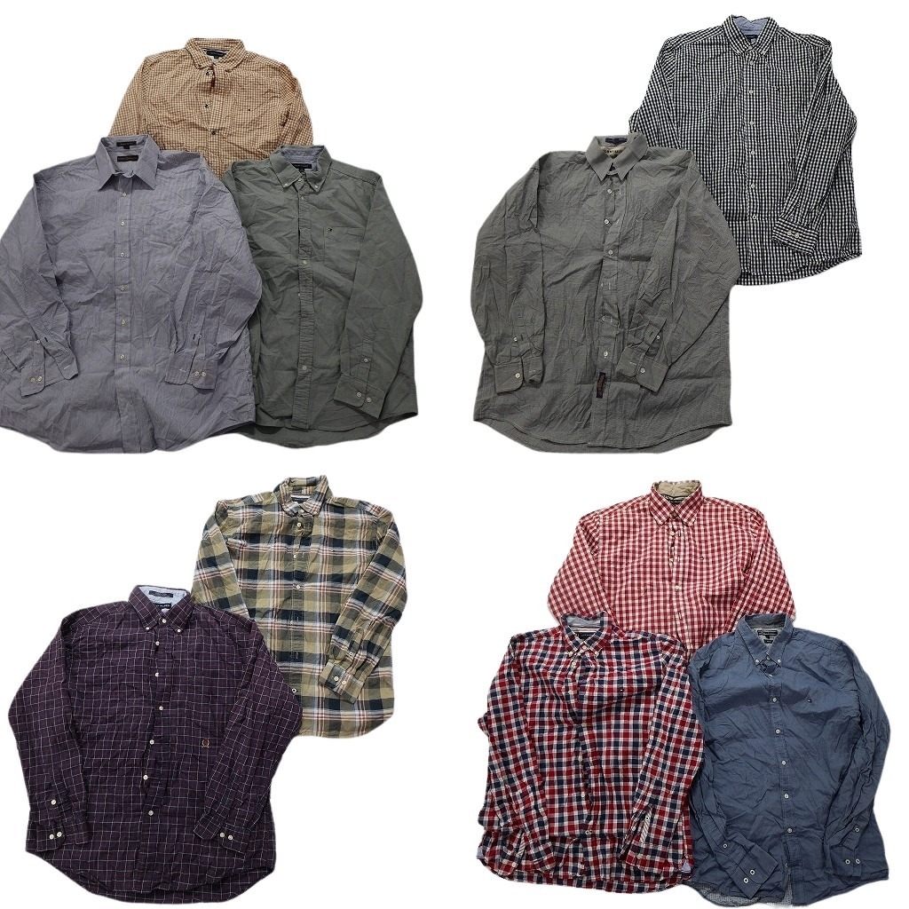 > 古着卸 まとめ売り トミーヒルフィガー 長袖シャツ 10枚セット (メンズ L ) ギンガムチェック 無地 ボタンダウン 中古 古着 NC1701