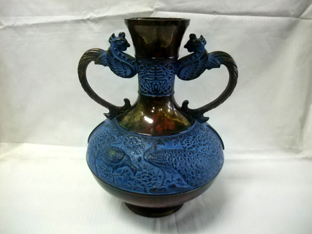 - 鋳銅 特殊新同金製 瑞峰作 金採孔雀文様 花器 花瓶 壺