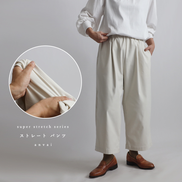 - 秋の新作 85cm 斜横ぐーんと伸びる伸縮ストレッチ生地 誰にでも似合うストレートパンツ ゆったり アイボリー K29