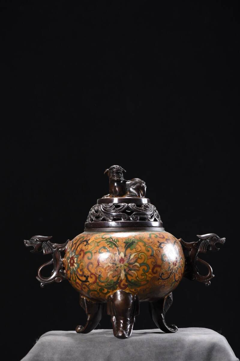 - 蔵友旧蔵出 銅製 景泰藍 琺瑯彩 三象足雙龍耳 獣鈕熏香爐 希少珍品 貴重品 置物 古賞物 密宗密教 供養品 仏教美術品