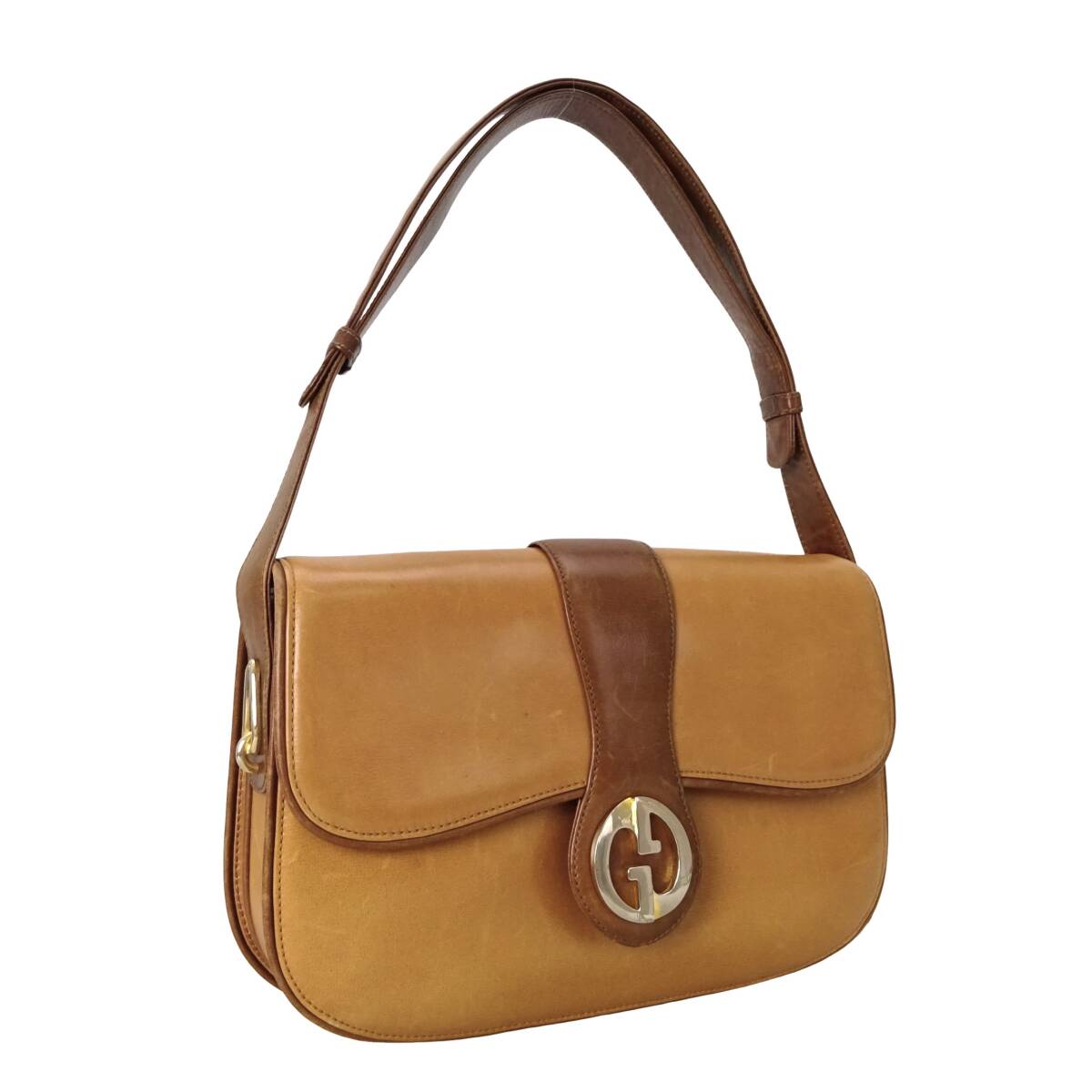 - 本物■グッチ■ヴィンテージ GG バックル キャメル ブラウン レザー ゴールド ショルダーバッグ ハンドバッグ