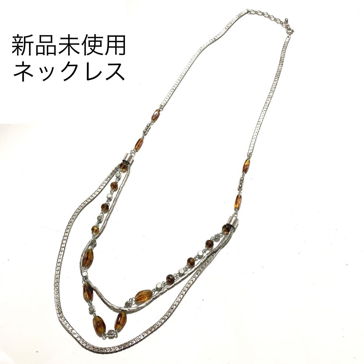 - 新品未使用 シルバー クリアブラウン 3連ロングネックレス ランダムストーン 茶