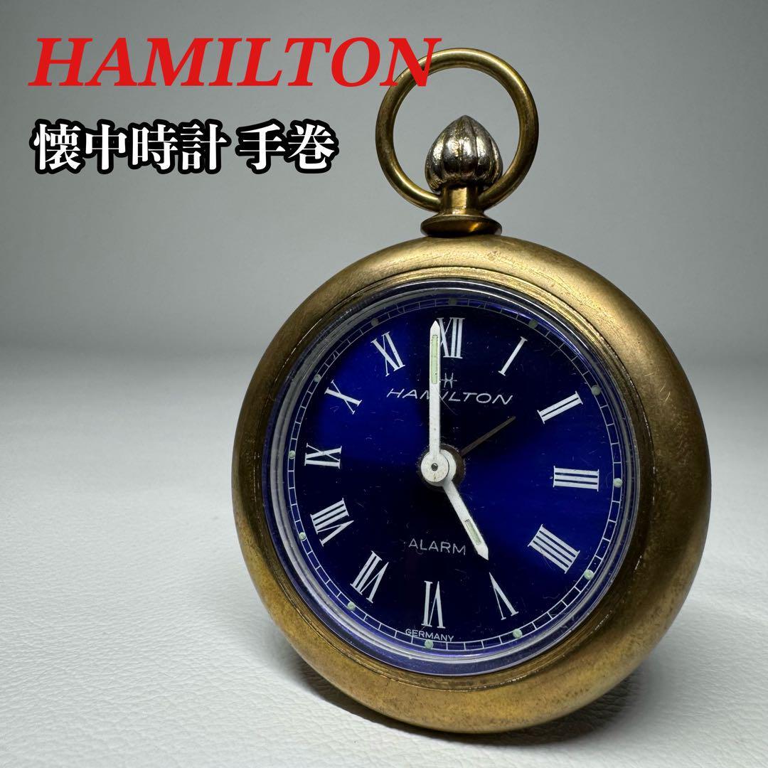 - 【動作未確認】HAMILTON ハミルトン 懐中時計 手巻き 真鍮 青文字盤 ローマン ゴールド アラーム