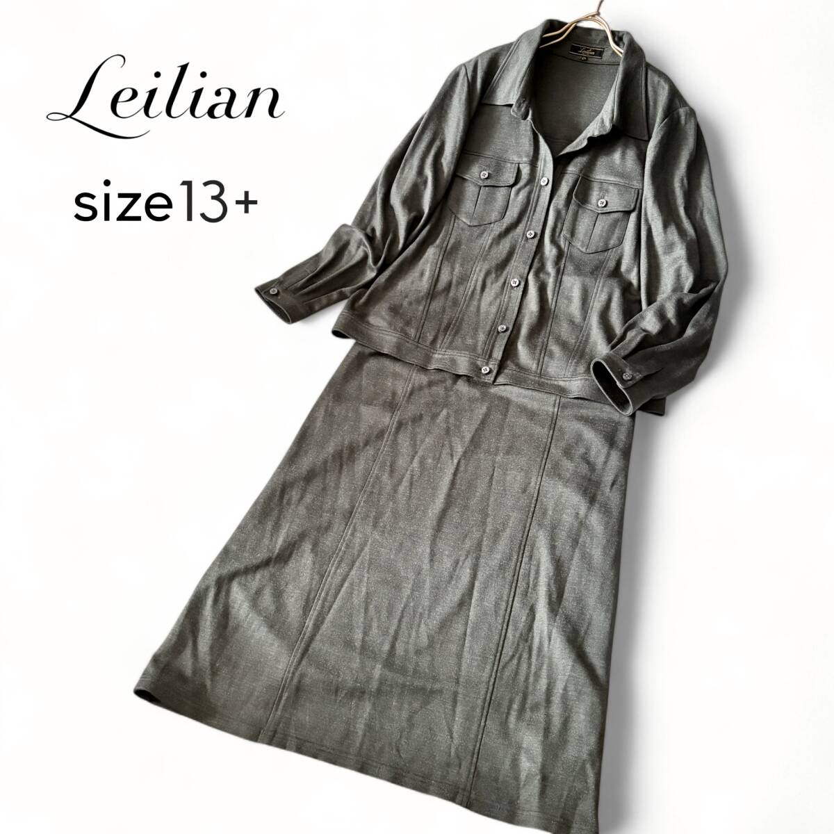 > 美品 10B05 XLサイズ 13プラス 《レリアン Leilian》上品な佇まい ラメ入り シャツジャケット スカート 上下セット セットアップ カーキ