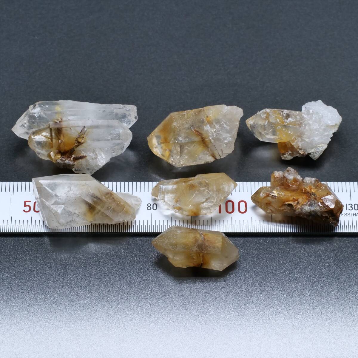 - 【鉱物 標本 金紅石 水晶 結晶 原石】パキスタン Ras Koh Mountains ルチル イン クォーツ 7本セット