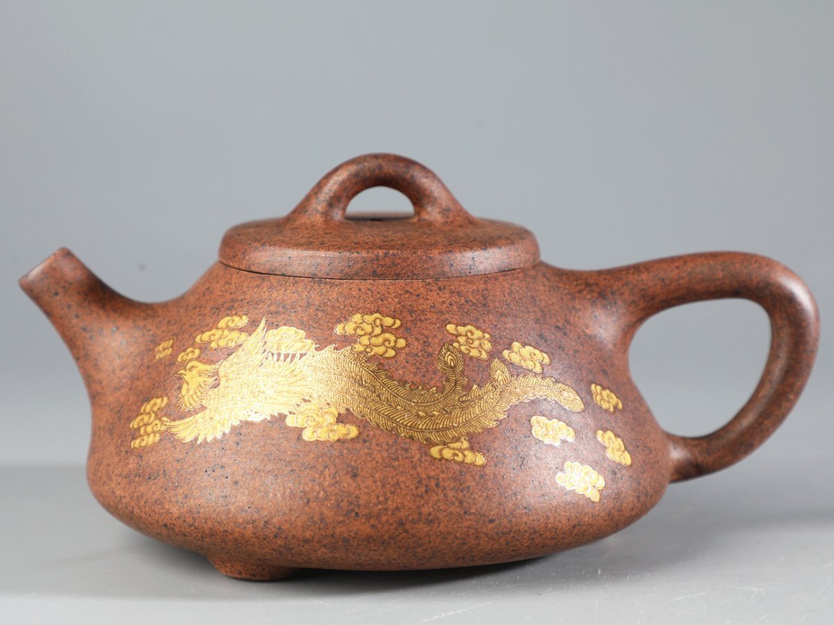 - 【安】清時代 大清乾隆年製 描金龍鳳紋茶壺 宜興紫砂 常滑 朱泥急須 煎茶道具 茶壷 古董品 時代物 270