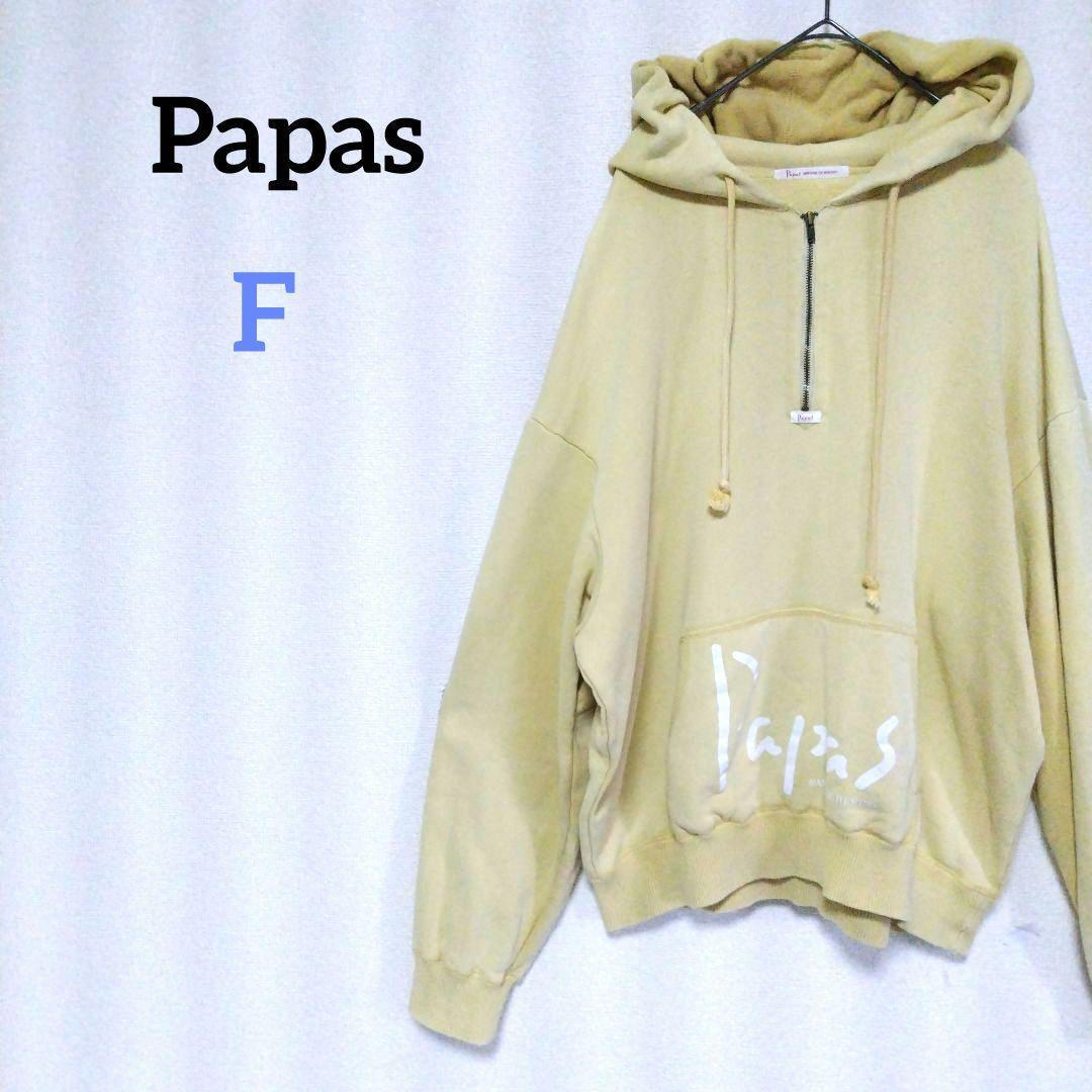 - Papas パパス ハーフジップパーカー フーディー ロゴ ワッペン プルオーバー ゆるだぼ オーバーザイズ ベージュ イエロー