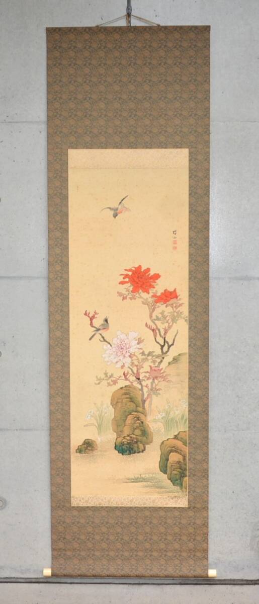 - 22◆初荷です ◆掛軸 牧櫻山 極彩色花鳥之図 真作 絹本 ◆二重箱 大正~昭和の画家