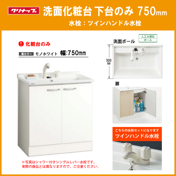 - 洗面化粧台 下台のみ(ミラー部なし) ツインハンドル水栓 幅:750mm BGAL75TNTWWJTS クリナップ BGAシリーズ
