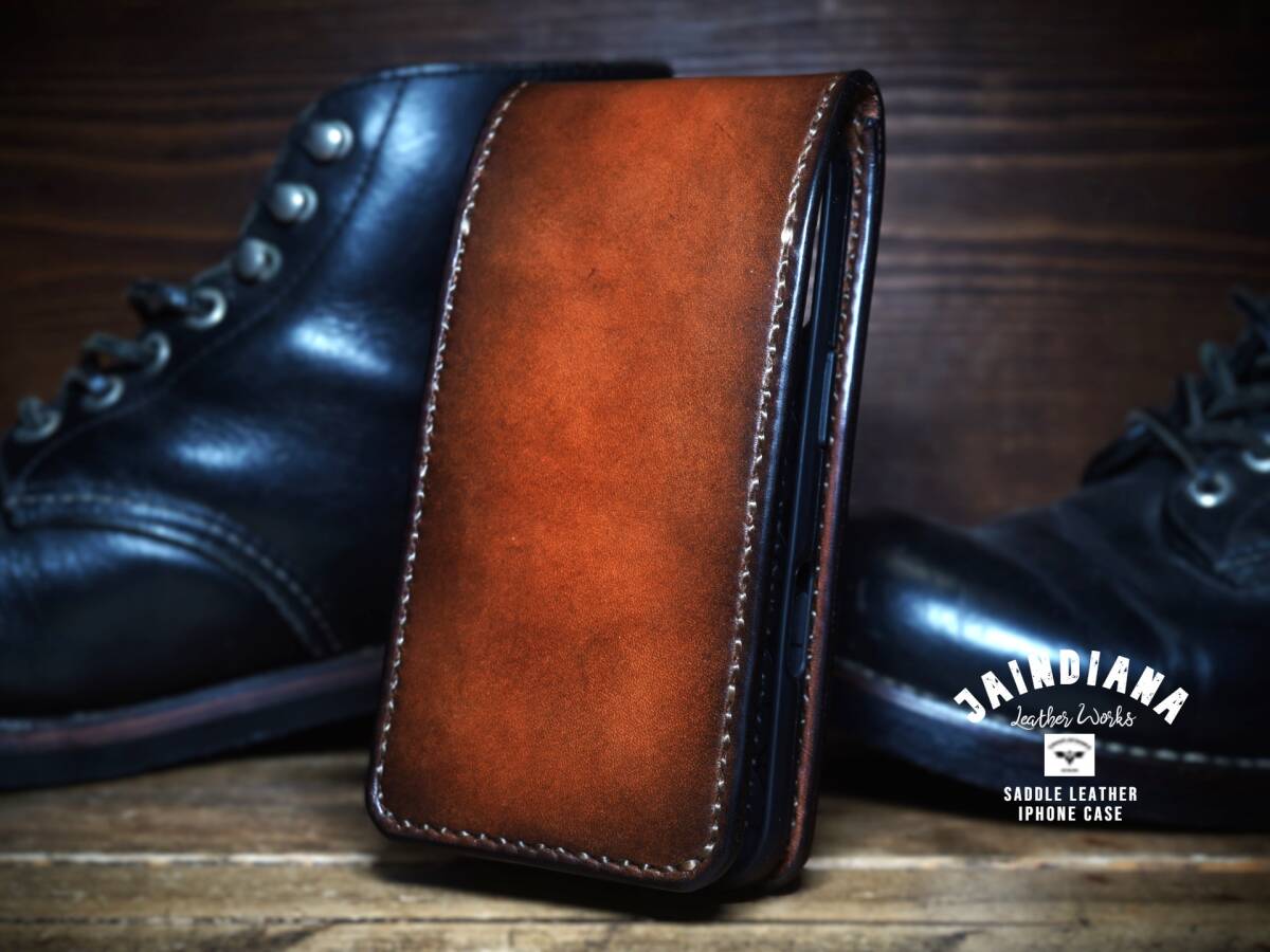 > iPhone17ケース 手縫い サドルレザー ビンテージ染めブラウン (iPhone17pro仕様での製作も可)