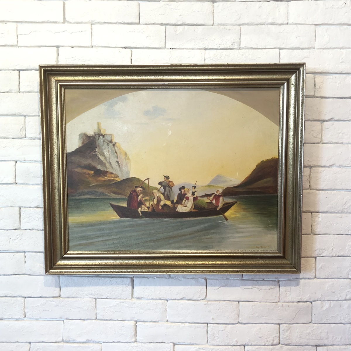 ゴールドカラーの奥行きのあるフレームに、Romantische Elbeの題が付いた油絵のパネルがはめ込まれています。