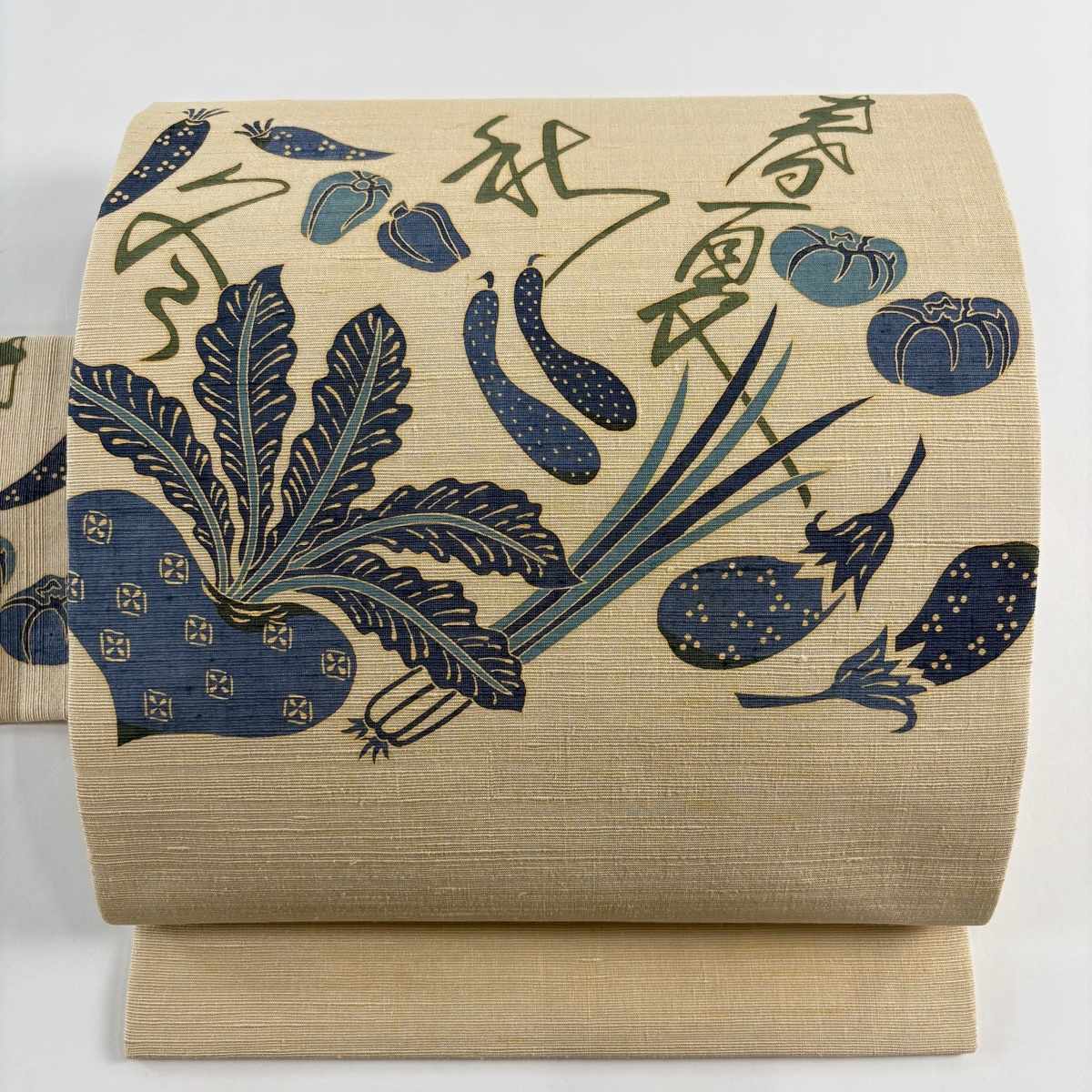 - 名古屋帯 秀品 落款 一夢 文字 野菜 金糸 ベージュ 正絹 【中古】