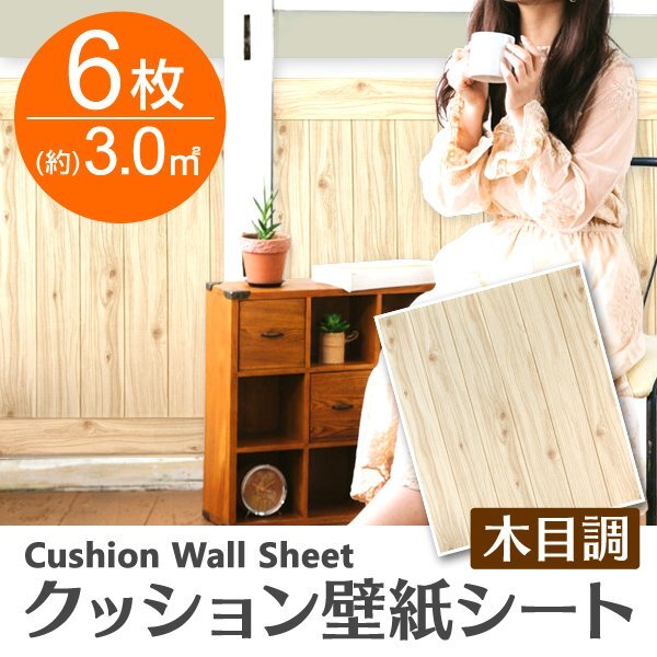 > 【ナチュラル/6枚】木目調 クッションシート 約70×60cm 貼るだけ簡単 壁紙シール おしゃれ DIY クッション ブリック ウォールステッカー