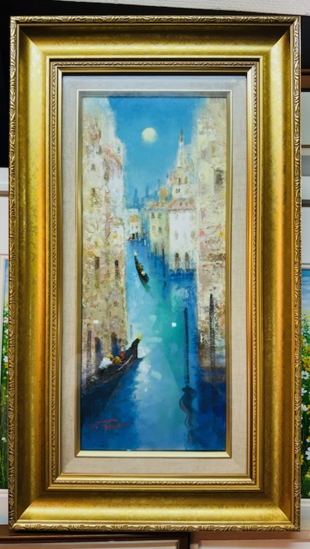 > 真作保証 谷田穎郎 直筆サイン 幻想の街 (月あかり) 風景画 油彩 油絵 街並 月 額装品 絵画 額 縦62cm×横35.6cm USEDです