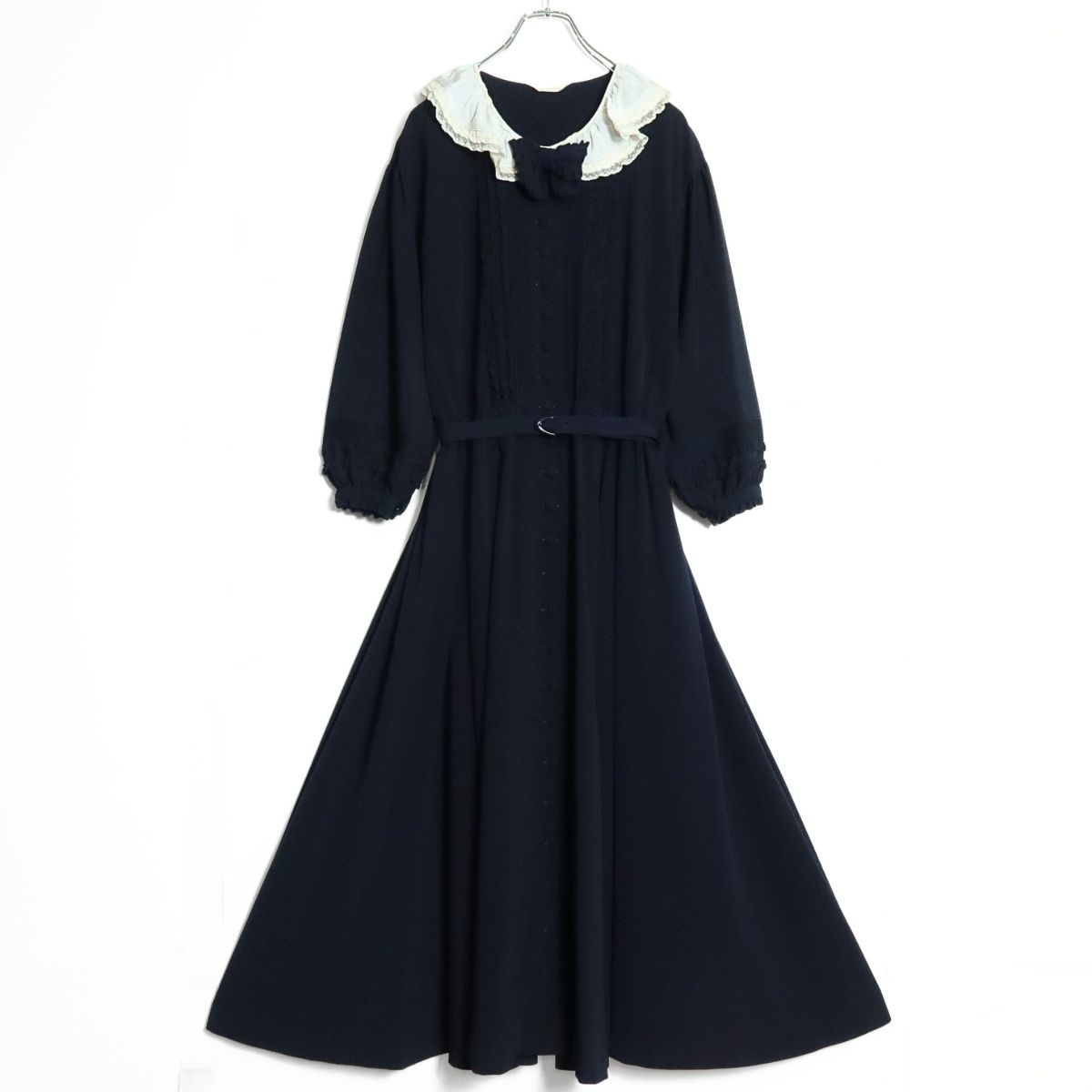 > 【美品】ピンクハウス★パフスリーブ七分袖ワンピース ネイビー系 レトロ可愛い♪清楚なレース襟&リボン♪無地 z15622