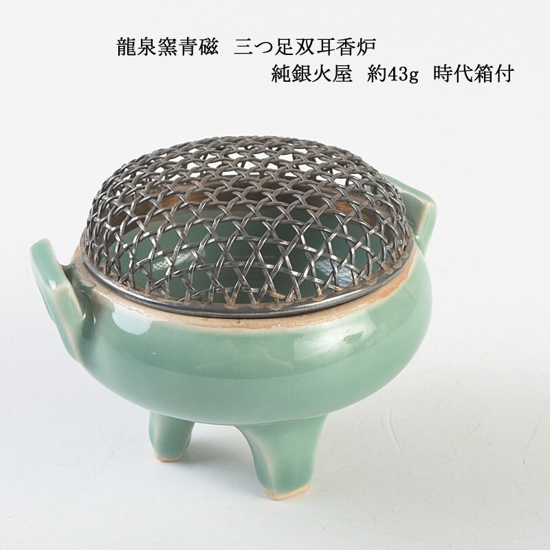 - 中国美術 龍泉窯青磁 三つ足双耳香炉 純銀火屋 約43g 時代箱付 古玩 SAXP